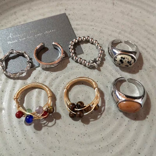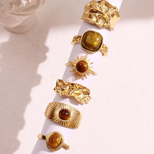 Set de 7 bagues élégantes vintage marron avec œil de tigre